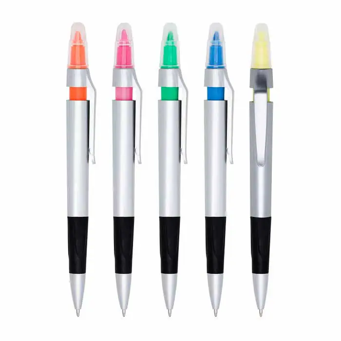Caneta plástica personalizada esferográfica e marca texto com corpo prata. Possui tampa protetora no marca texto e detalhe emborrachado com relevo na parte inferior. Aciona por clique.