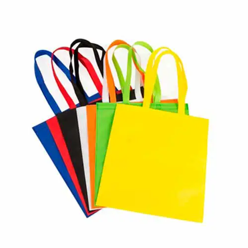 Sacola colorida com alça em material TNT, possui símbolo ecológico/reciclável na costura da alça.