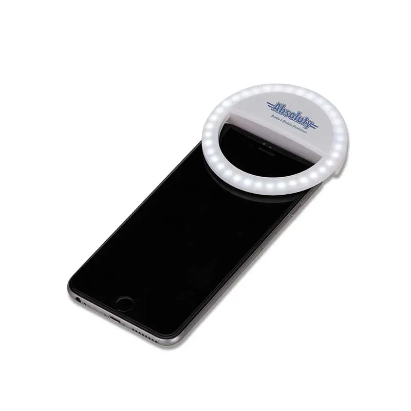 Anel de iluminação para celular, utilizado para fotos em formato selfie. “Ring light” plástico no formato “presilha” para encaixe, possui três estágios de iluminação acionados pelo botão superior. Acompanha cabo USB para carregamento.