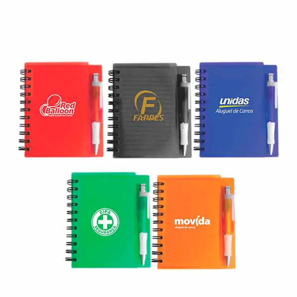 Bloco de anotações com capa de plástico resistente e caneta esferográfica.