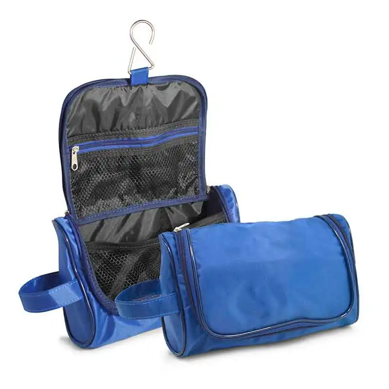 Necessaire cabideira em Nylon 70 plastificado para brindes promocionais. Possui abertura principal com zíper, um bolso interno com tela, uma alça de mão e um gancho de metal para pendurar. Perfeita para armazenar seus itens de higiene pessoal e acessórios do dia a dia. Ideal para eventos corporativos.