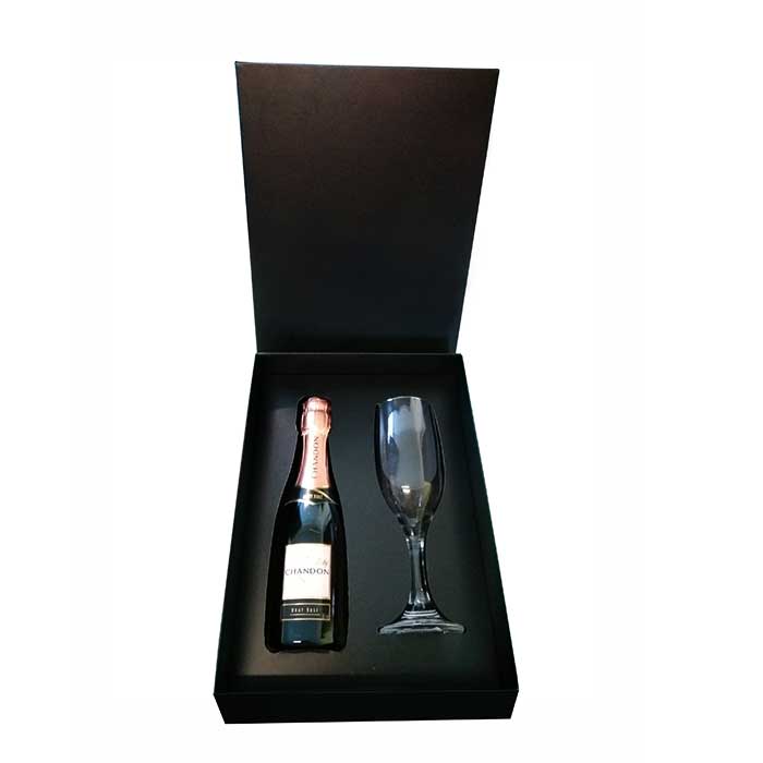 Kit contendo 1 Espumante Baby Chandon Brut Rose 187ml e 1 taça de vidro ( Opção para personalização em jateado) + berço e caixa de papel (Opção para personalização Offset)