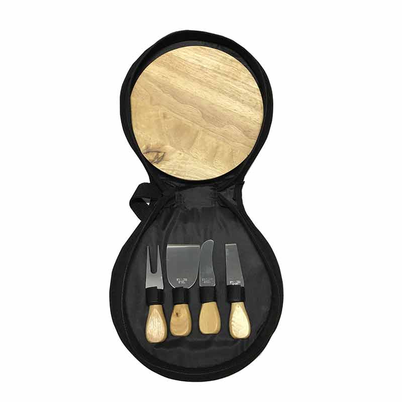 Kit contendo 1 jogo para queijo com 1 tábua (opção para gravação) e 4 peças de servir.+ estojo portátil com ziper (opção para gravação)