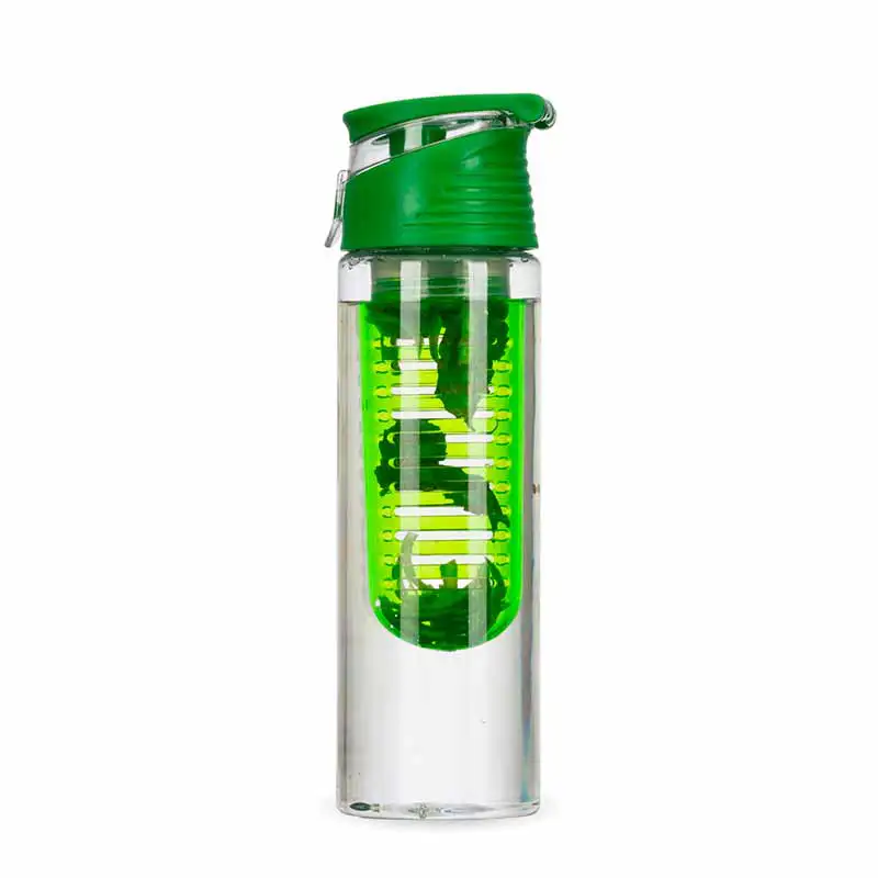 Garrafa plástica 750 ml com infusor de frutas, tampa e alça, plástico utilizado AS (estireno de acrilonitrilo). Disponível em várias cores. Dimensão Produto: 25,0xø7,0cm