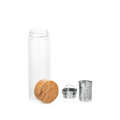 Garrafa em vidro de borossilicato com parede dupla e tampa em bambu Incluso 2 infusores em aço inox