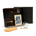 Gravação: Laser na bandeja e nas canecas, uma gravação em Silk/Digital na tampa da caixa