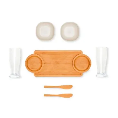 Kit com 7 peças sendo petisqueira em Bambu, 2 potes de fibra de bambu, 2 copos de vidro para cerveja/drinks, 2 espátulas de Bambu - 14cm e 1 cerveja Heineken - 600ml. Base: 33 | 13,1 | 1,5 cm