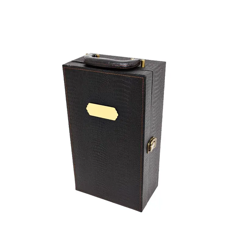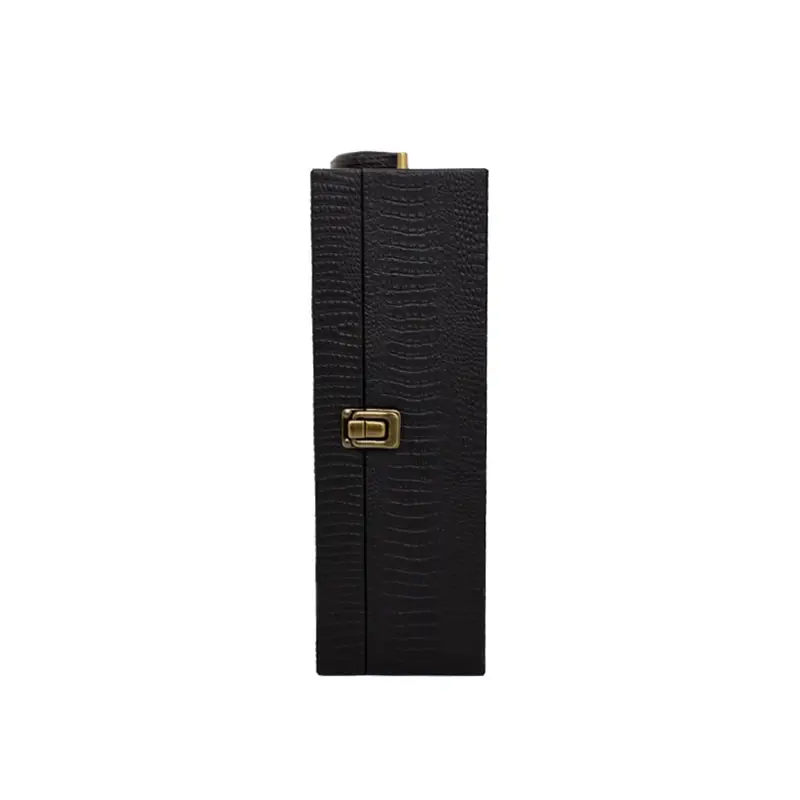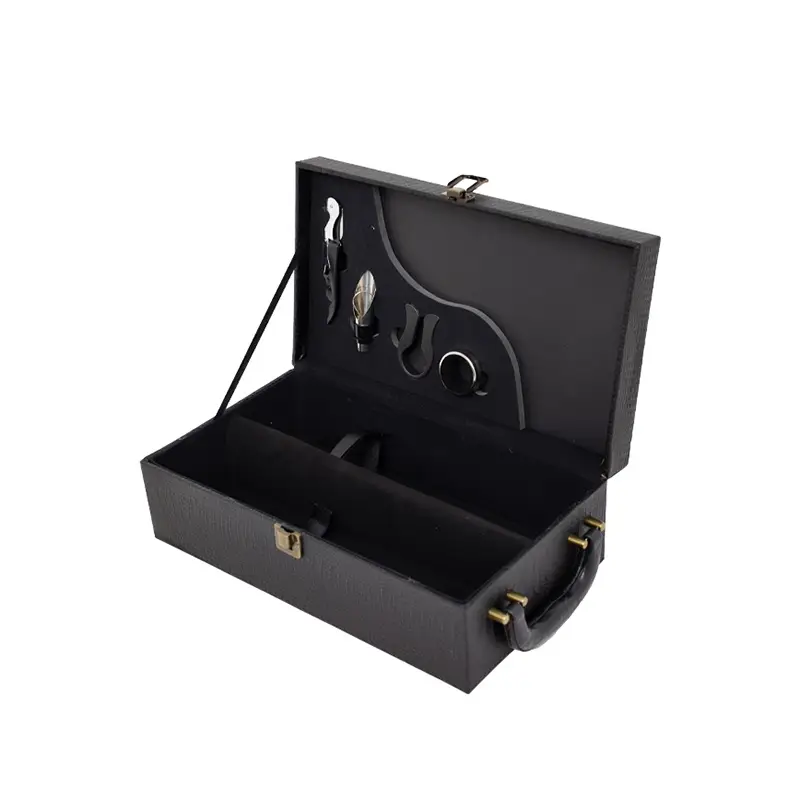 Kit vinho 4 peças em maleta de sintético texturizada. Contém saca-rolhas metálico, bico condutor com tampa, cortador de lacre e wine collar. Maleta com alça, trava de segurança e plaquinha plástica fixa com fita dupla face. Área interna revestida de veludo com suportes de nylon com velcro e duas repartições para garrafas.