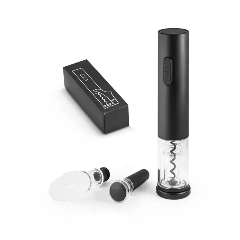 Conjunto de saca rolhas elétrico e acessórios em ABS e TPE. Incluso corta cápsulas, rolha de vácuo e salva-gotas. Com pilhas incluídas. Fornecido com caixa. Tamanhos: Saca rolhas: 45 x 227 mm | Caixa: 241 x 90 x 54 mm.