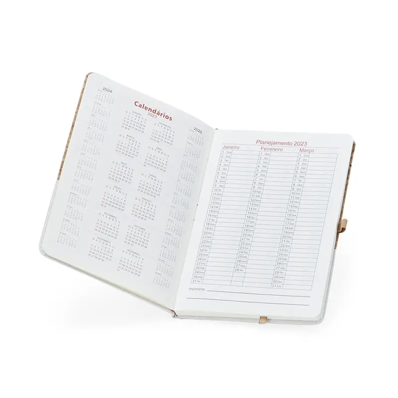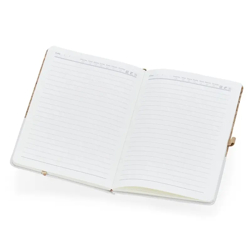 Caderneta A5 de Cortiça. Ideal para se organizar no trabalho ou até mesmo nas tarefas de casa. Feito com material de qualidade e preço bastante atrativo, possui detalhes em linho, suporte para caneta e marcador de páginas em cetim. A caderneta possui 93 folhas marfim com pauta e páginas de planejamento.