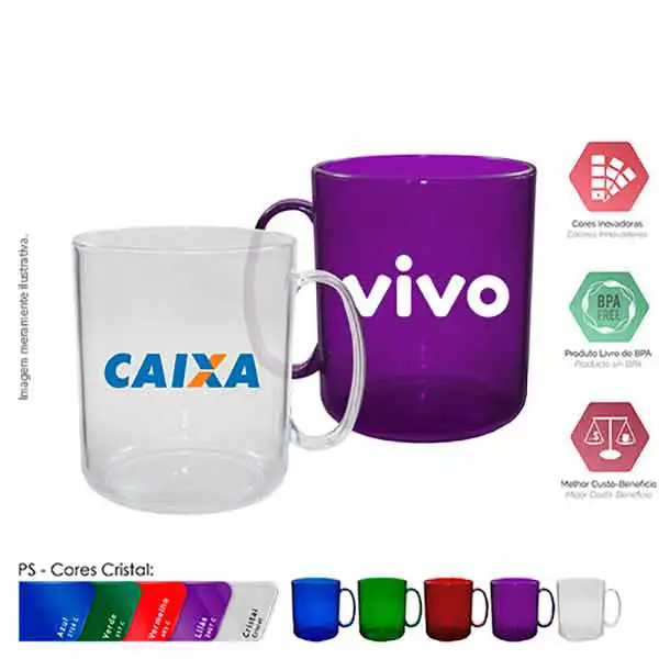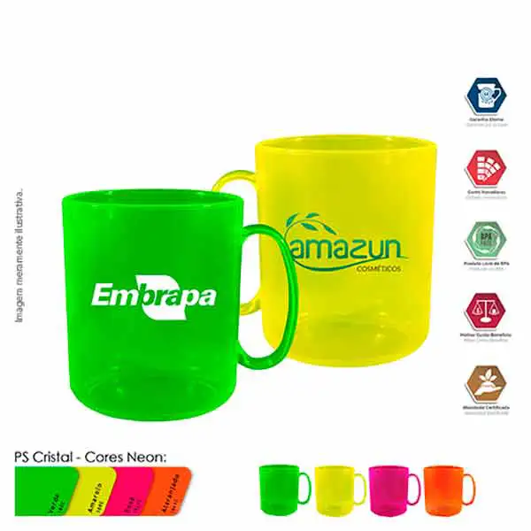 Caneca cristal neon 400ml: Caneca plástica translúcida, de alta resistência, atóxica e capacidade para 400 mL.