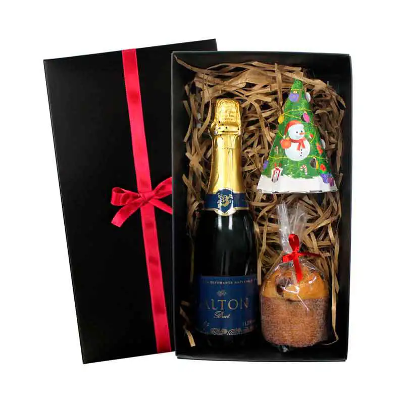O Kit Espumante Mini Panetone para o Natal - BV683, é um lindo kit composto por: 1 Espumante Salton 375ml, 1 Mini Arvore de Natal contendo 50g de Amêndoas, 1 Mini Panetone Bauducco, em uma caixa duplex preta.
