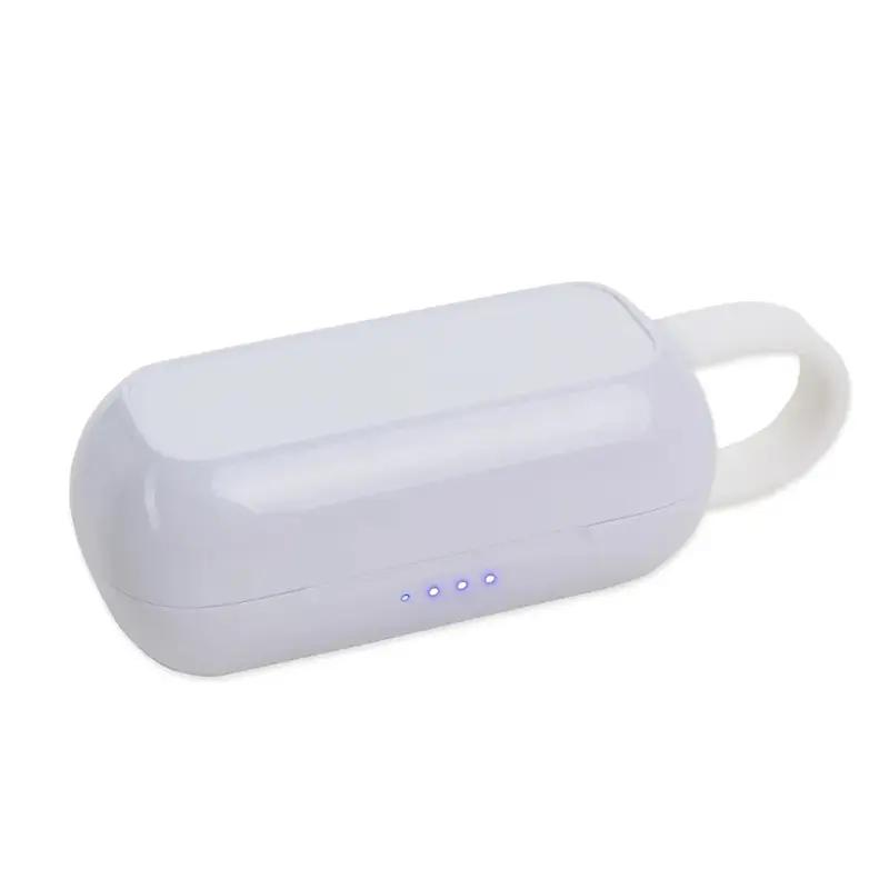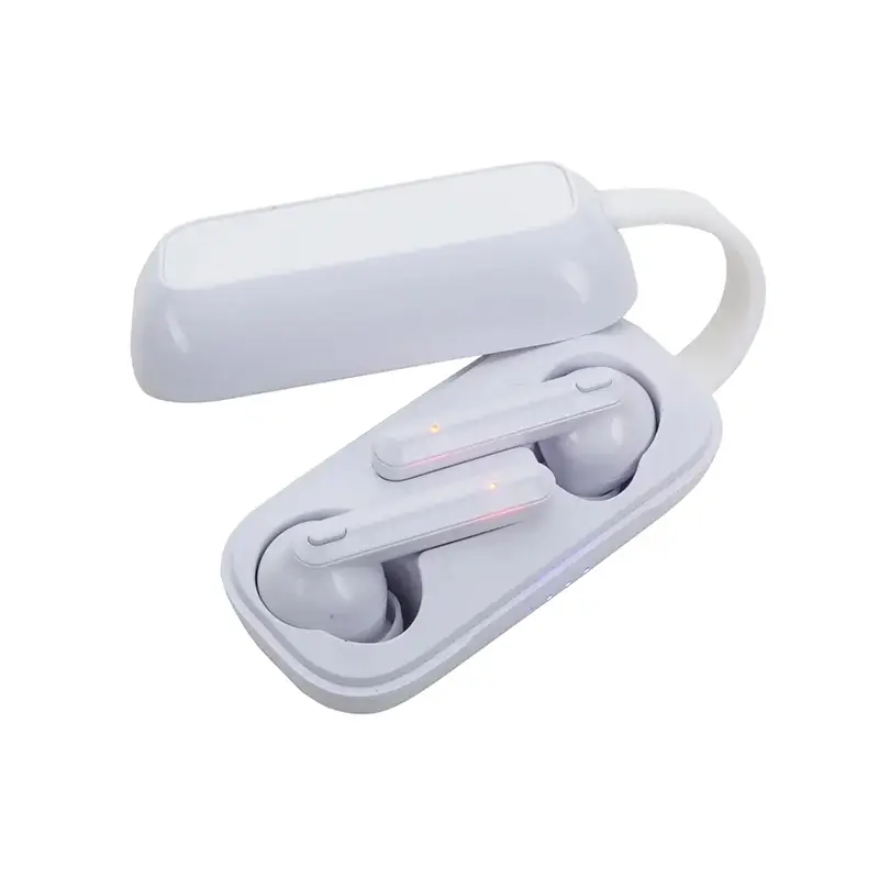 Fone de ouvido sem fio intra-auricular modelo “Earbud”. Possui estojo de recarga com capacidade de 280mAh. Material: ABS