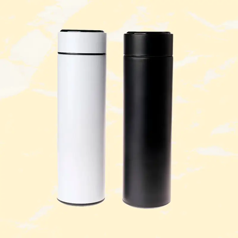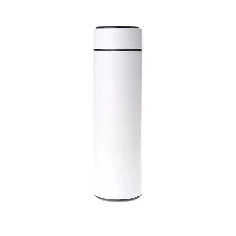 Garrafa térmica em aço inox, parede dupla, isolante a vácuo, 500ml, tampa e termômetro dígital com bateria substituível.