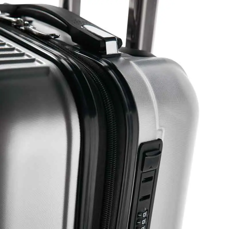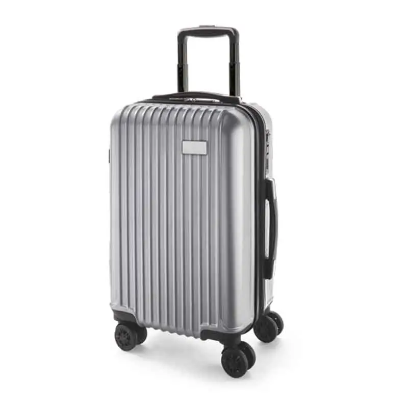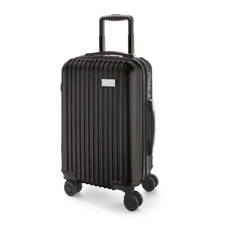 Mala de viagem executiva. ABS e PET. Interior forrado, com divisória. 4 rodas duplas giratórias. Pega extensível em alumínio, com mola (altura pega estendida: 525 mm). Fecho de segurança com senha. Chapa metálica removível para fácil gravação. 320 x 480 x 225 mm | Chapa: 60 x 30 mm