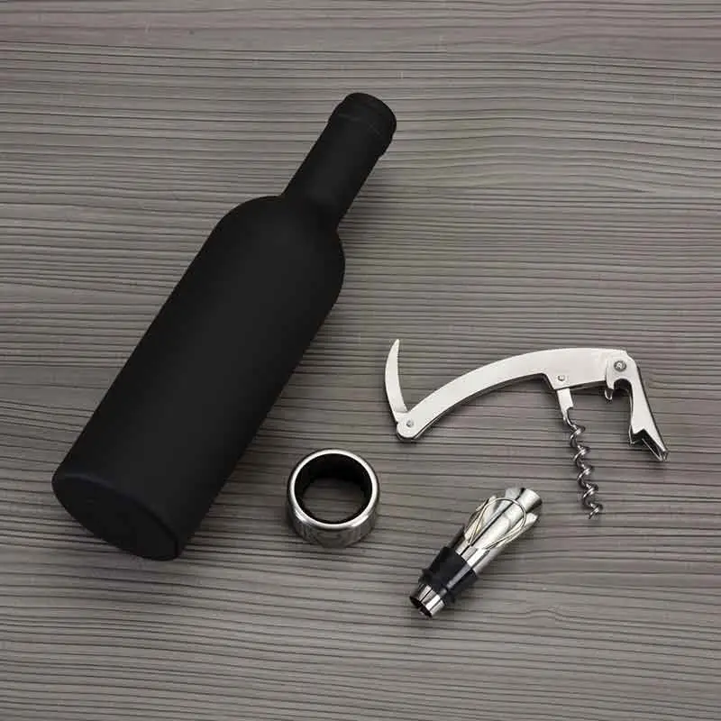 Kit abridor de vinho garrafa 3 peças, material plástico resistente e revestido internamente com espuma. Possui wine collar, bico condutor com tampa e saca rolhas.
