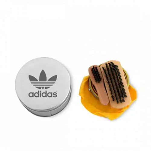 Kit de limpeza de sapatos com 6 peças: 1 cera incolor para sapatos, 1 flanela amarela, 2 escovas em madeira, 1 calçadeira e 1 embalagem lata. 98 x 56 mm