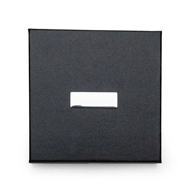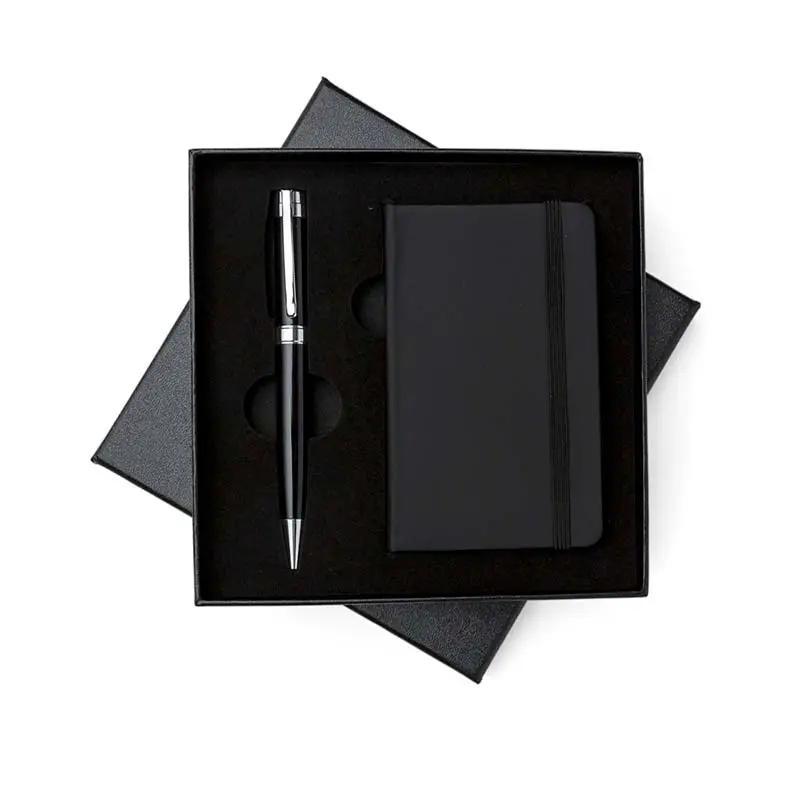 Kit executivo 2 peças em estojo de papelão com tampa e parte interna revestida de espuma. Contém: caneta metal preta com anel e detalhes em prata, caderneta de bolso em material sintético com aproximadamente 80 folhas amarelas sem pauta. Acompanha placa metálica para gravação.