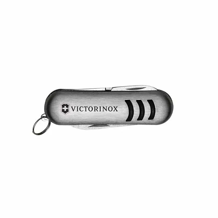 Mini canivete metal 3 funções com detalhes emborrachados preto(três linhas frente e verso). Possui: lixa, lâmina de corte e mini tesoura e acompanha pequena argola para utilizar como chaveiro.