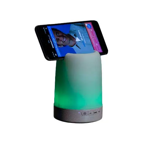 Caixa de som multimídia com luzes, suporte para celular e porta caneta. Material plástico resistente na cor branca fosca, parte superior com falante vazado na área interna, pode ser utilizado como porta caneta ou suporte para celular. Parte inferior branca leitosa com linhas em relevo, borracha inferior anti deslizante e alça de alumínio.