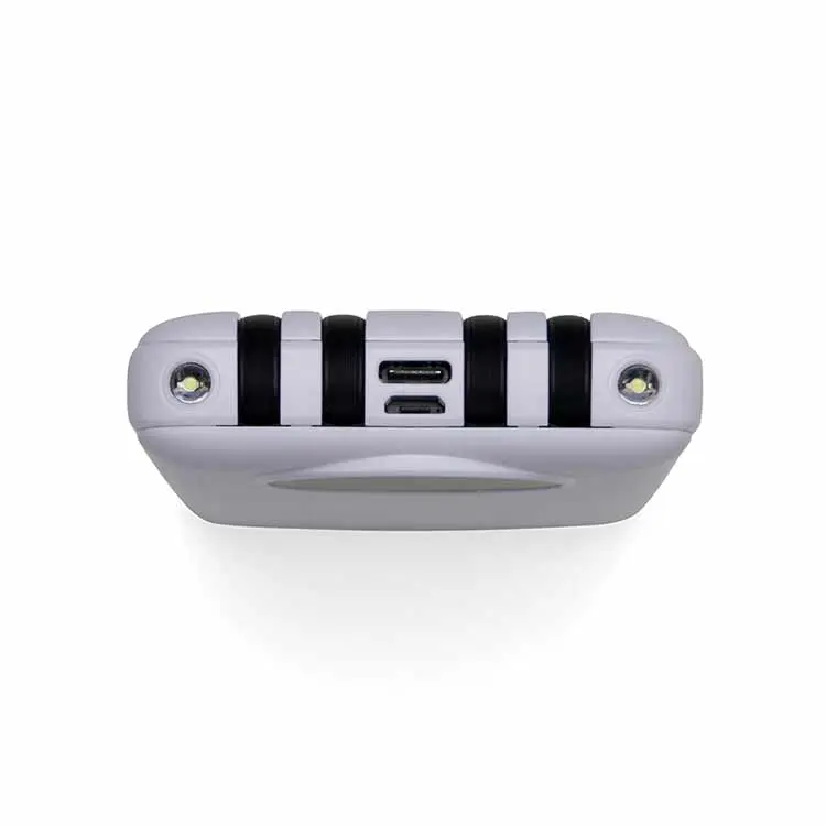 Carregador portátil de 10.000mAh com display digital indicador de bateria, contém duas lanternas de led e quatro cabos de saída acoplados, sendo: saída Lightning, saída Tipo-C, saída V8 e saída USB. O carregador possui uma porta USB dupla (entrada e saída) com carga rápida e outras duas portas de entrada: V8 e Tipo-C. Acompanha cabo USB.