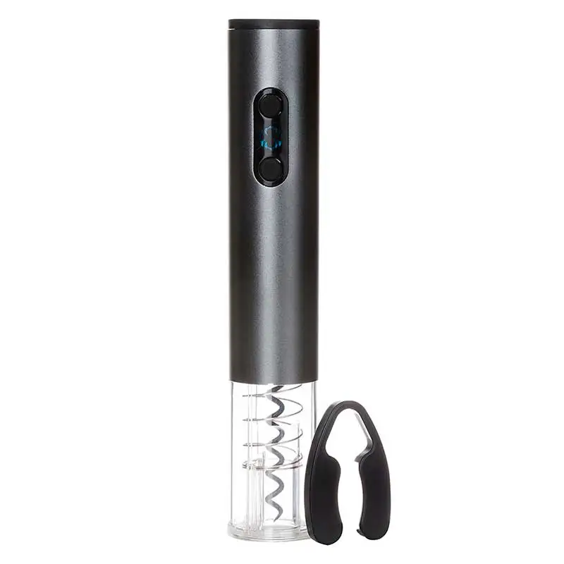 Saca rolhas elétrico com LED e cortador de lacre. Parte superior em alumínio e parte inferior acrílica, possui compartimento superior com tampa para 4 pilhas AA (não acompanha pilhas), painel com iluminação LED e botões para extração e remoção de rolhas. No modo extração a área acrílica é iluminada pelo LED. Acompanha cortador de lacre. Cores: preto e cinza escuro.