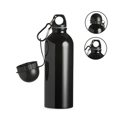 Squeeze 500ml de inox com pintura metalizada, tampa rosqueável e acompanha um segundo bico com mosquetão (não é térmico).