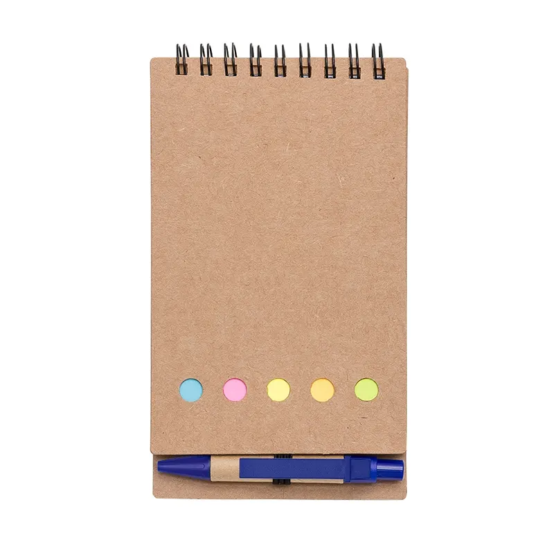Bloco de anotações ecológico com autoadesivos e mini caneta. Bloco com wire-o e detalhes vazados na capa, contém conjunto de cinco bloquinhos autoadesivos coloridos, bloco autoadesivo pequeno, miolo com folhas pautadas e suporte de nylon com mini caneta de papelão com carga esferográfica na cor azul e acionamento por clique.