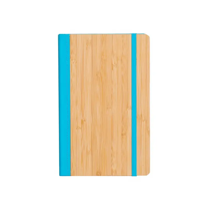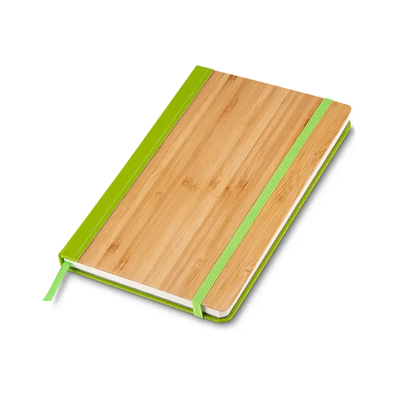 Caderno de anotações, capa de bambu e PU com elástico e miolo com 70 folhas.