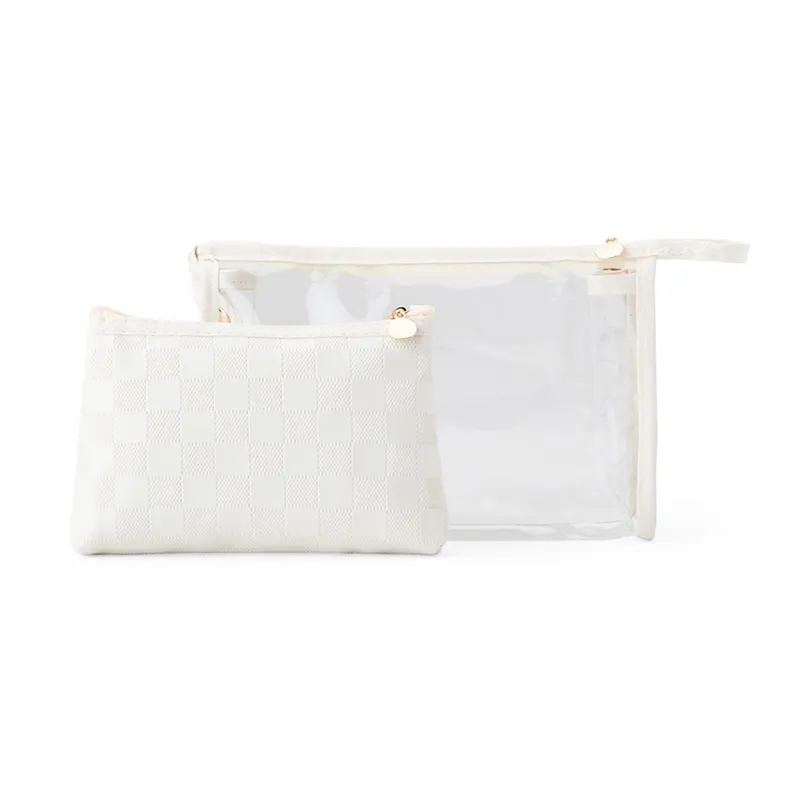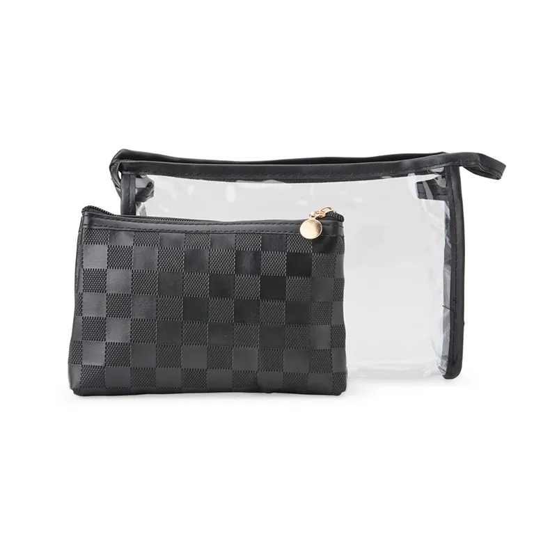 Uma dupla de nécessaires que se complementam e oferecem as possibilidades de organização. O nécessaire maior é feito em PVC impermeável, com detalhes e alça lateral em couro sintético, além de fechamento em zíper. O nécessaire menor, por sua vez, é confeccionado inteiramente em PU impermeável, apresenta fechamento em zíper e design compacto.