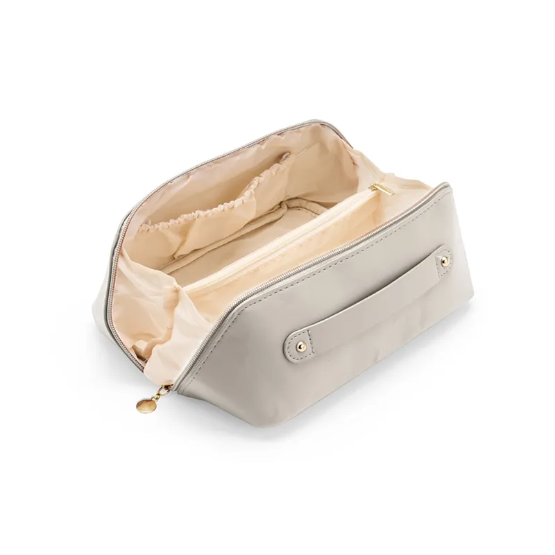 Um nécessaire versátil feito em poliuretano (PU) impermeável com abertura em 180 graus que remete ao formato de uma concha. O compartimento interno conta com dois bolsos laterais abertos e um, localizado na parte central do nécessaire, com fechamento em zíper. Possui alça para transporte.
