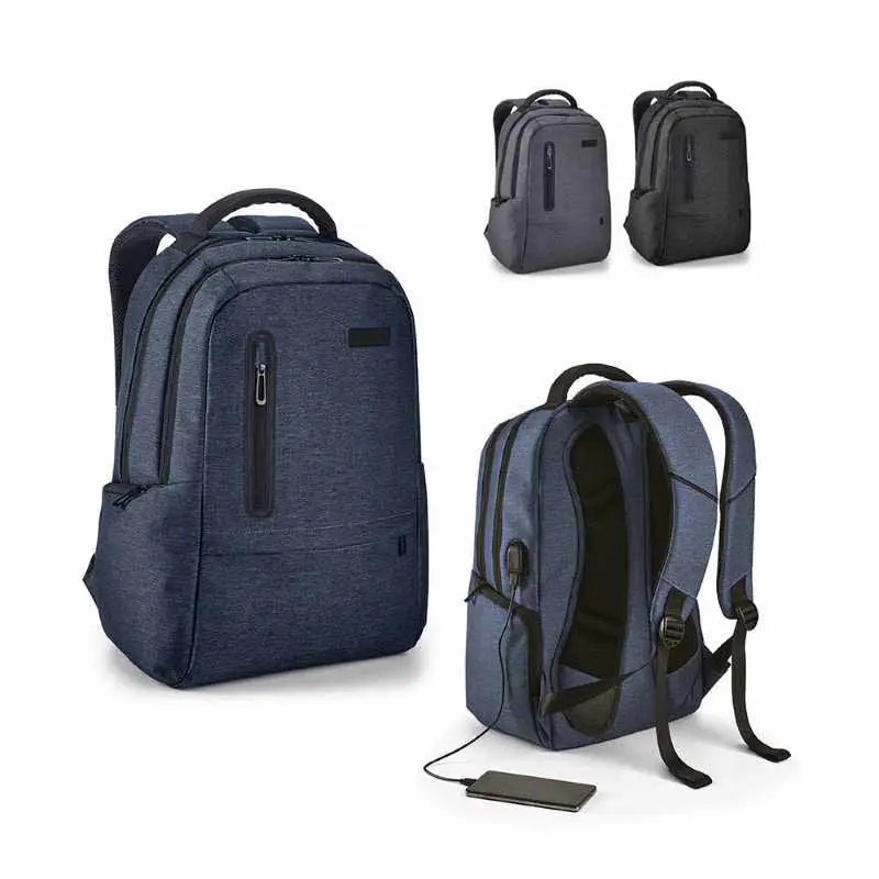 Mochila para notebook. Nylon 2Tone impermeável. Com 2 compartimentos. Compartimento posterior forrado, com bolso interior com zipper e divisória almofadada para notebook até 17'. Compartimento frontal forrado, com diversos bolsos interiores. 2 bolsos frontais e 2 bolsos laterais. Com porta USB e cabo USB/micro USB para ligar a dispositivos móveis (bateria portátil não inclusa). Parte posterior almofadada, com sistema de apoio acolchoado para as costas e alças almofadadas. Placa metálica removível com imã, para fácil gravação.