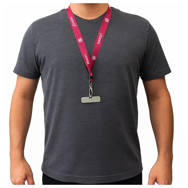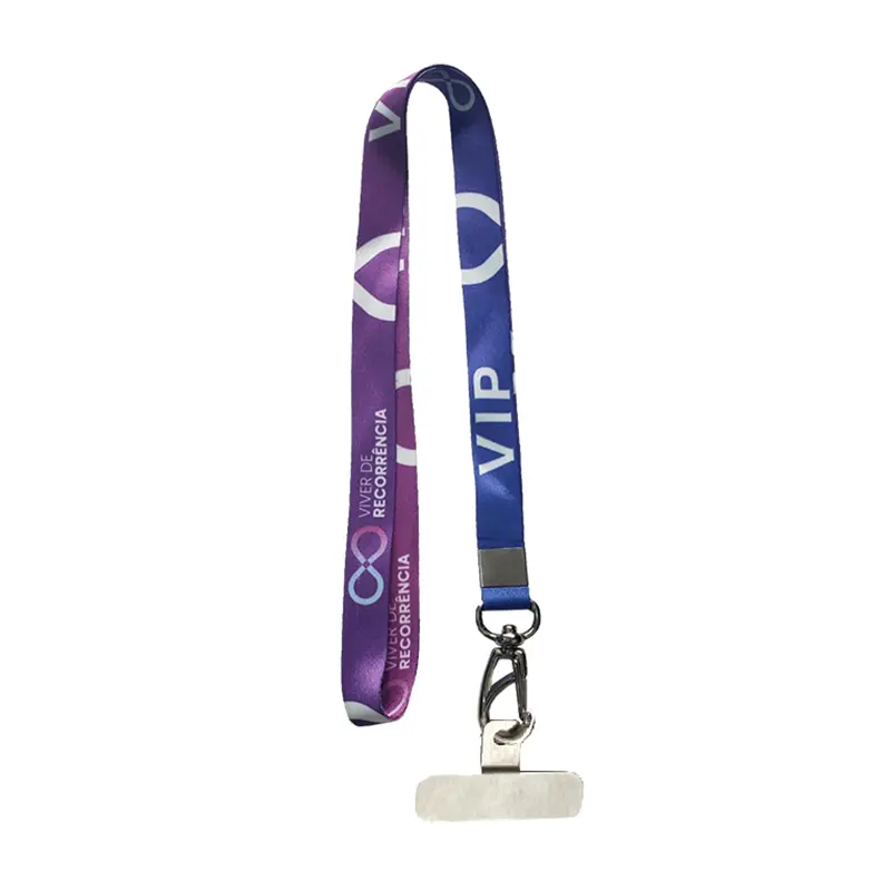 Cordão de pescoço para celular personalizado, comprimento de 85 cm, largura 2 cm, fechamento com chapinha de metal de 2 cm, placa de aço inox para celular e acabamento com mosquetão de metal de 2,2 cm.