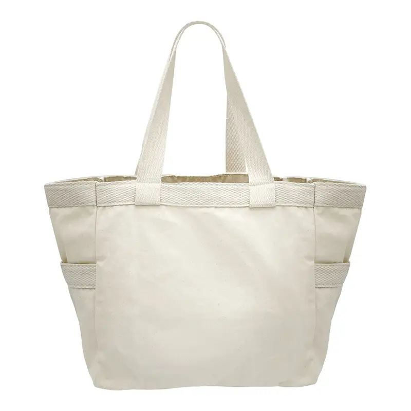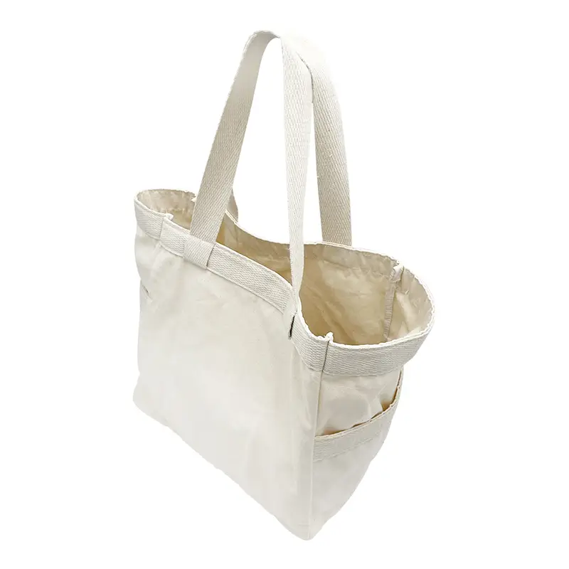 Sacolas ecológicas confeccionada com tecido 100% algodão cru, gramatura 540 g/m2, tamanho 33x32x21 cm (LxAxC), duas alças de fita de algodão de 40 mm de espessura e 30 cm de comprimento cada, dois bolsos laterias e acabemto com fita de algodão de 40 mm em toda a bolsa e bolsos.