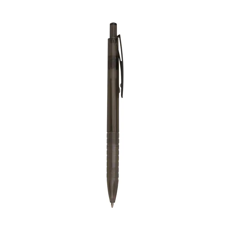 Caneta plástica translúcida com carga esferográfica azul e acionamento por clique.