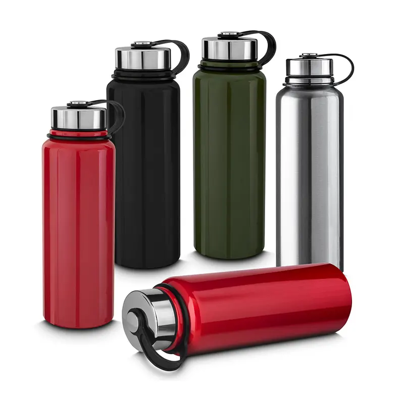Garrafa térmica Personalizada em aço inox com parede dupla com capacidade de 1L, tampa em aço inox rosqueável com anel de silicone para vedação com alça em plástico.