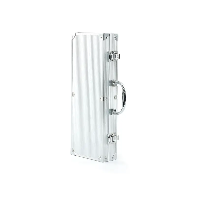 Kit churrasco 5 peças em maleta de alumínio com travas de segurança, contém três facas de corte, tesoura e chaira. Parte interna da maleta com revestimento em tnt e suportes de velcro para fixação das peças.