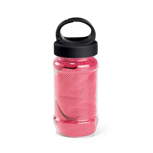 Toalha: poliamida e poliéster. Garrafa: PP e PET. Toalha refrescante, quando molhada permanece fria durante horas. Se aquecer, basta balançar reativando sua frescura. Reutilizável e lavável à máquina. Garrafa com mosquetão inclusa (food grade). Toalha: 300 x 800 mm