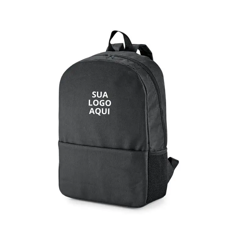 Mochila em 600D. Bolso lateral em tela e bolso frontal. Parte posterior e alças almofadadas 310 x 450 x 120 mm