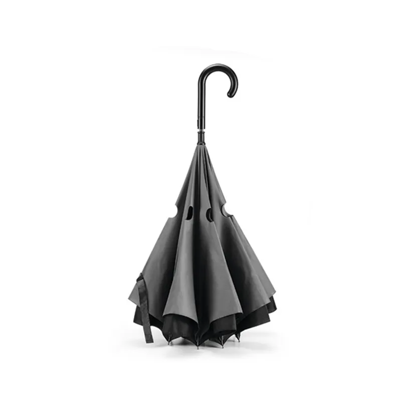 Guarda-chuva reversível em pongee 190T com capa dupla, cabo em metal e varetas em fibra de vidro. O guarda-chuva de estrutura patenteada tem abertura manual e fecho automático. ø1050 x 790 mm