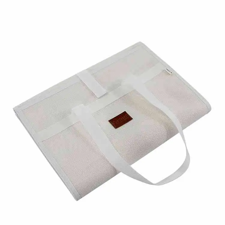 Esteira personalizada em tela sintética, etiqueta de courvin e bolso frontal.