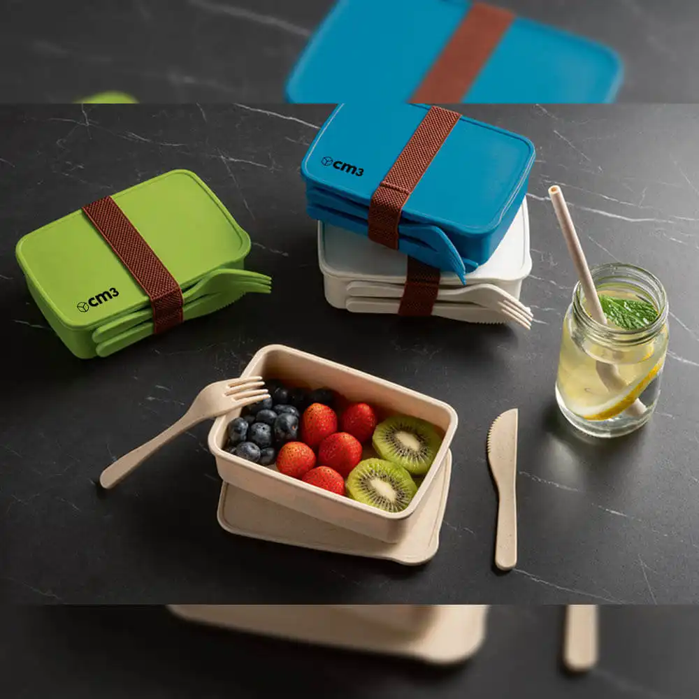 Marmita de plástico e fibra de bambu, para microondas, com elástico pra fechar e acompanha garfo e faca.