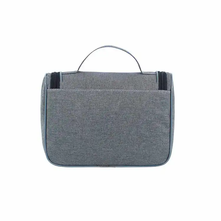 Necessaire personalizada com fechamento por zíper de correr, gancho para pendurar, bolsos internos em tela com zíper e bolsos em elástico.