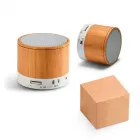 Caixa de som com microfone. Bambu. Com transmissão por bluetooth, ligação stereo 3,5 mm e leitor de cartões TF. Autonomia até 3h. Capacidade: 300mAh. Função para atender chamadas, controle de volume, conexão à playlist do dispositivo móvel e rádio FM. Incluso cabo USB/micro USB para carregar. Fornecida em caixa presente kraft. ø60 x 52 mm.