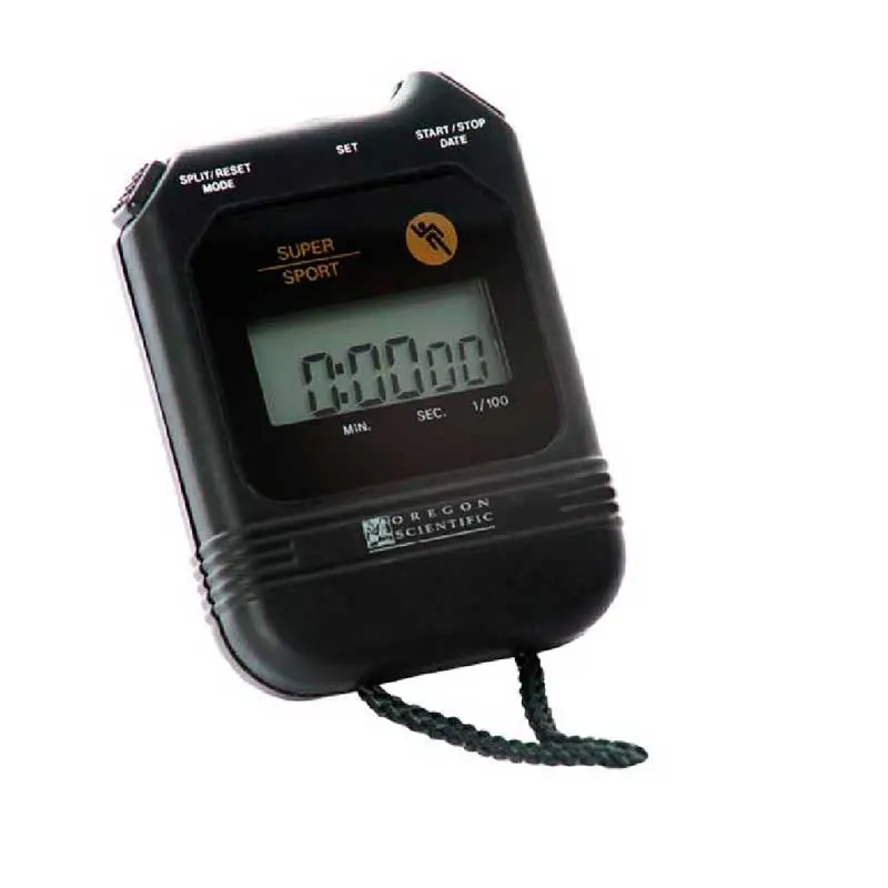 Cronômetro digital de 60 minutos com mesura em 1/100 segundos. Relógio e calendário digital.