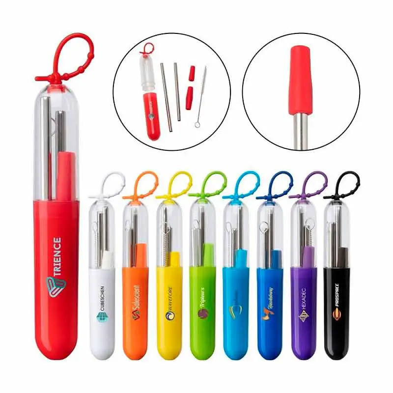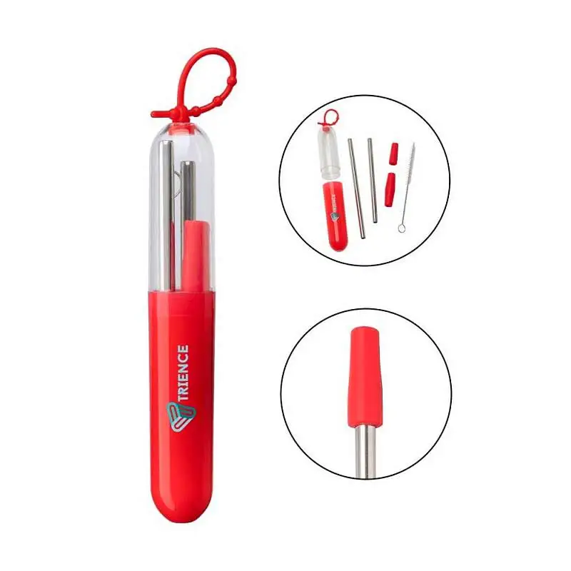 Kit canudo com 5 peças em caixa oval . Tampa tem alça de bloqueio de silicone frisado para anexar a mochila, bolsa ou sacola. Inclui 2 peças em aço inoxidável ( canudos ) que podem ser usados individualmente ou juntados por um conector para formar um tamanho maior de 26 cm. Acompanha escova de limpeza. Aprovado pelo FDA. BPA livre. Material: Aço inox, silicone e plástico ABS. Tamanho:15,24cm.