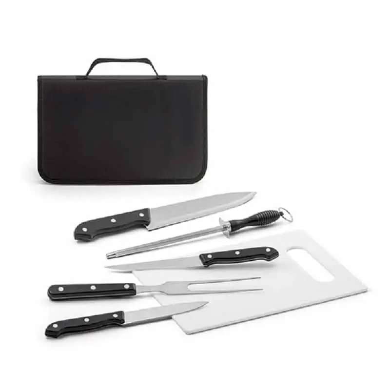 Kit churrasco. Aço inox e PP. Tábua e 5 peças em estojo de 210D. Food grade. Estojo: 350 x 230 x 40 mm | Tábua: 283 x 192 x 5 mm.