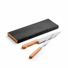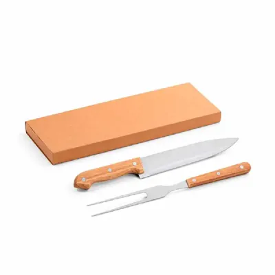 Kit churrasco. Aço inox e bambu. 2 peças em caixa kraft. Food grade. Caixa: 340 x 115 x 25 mm.