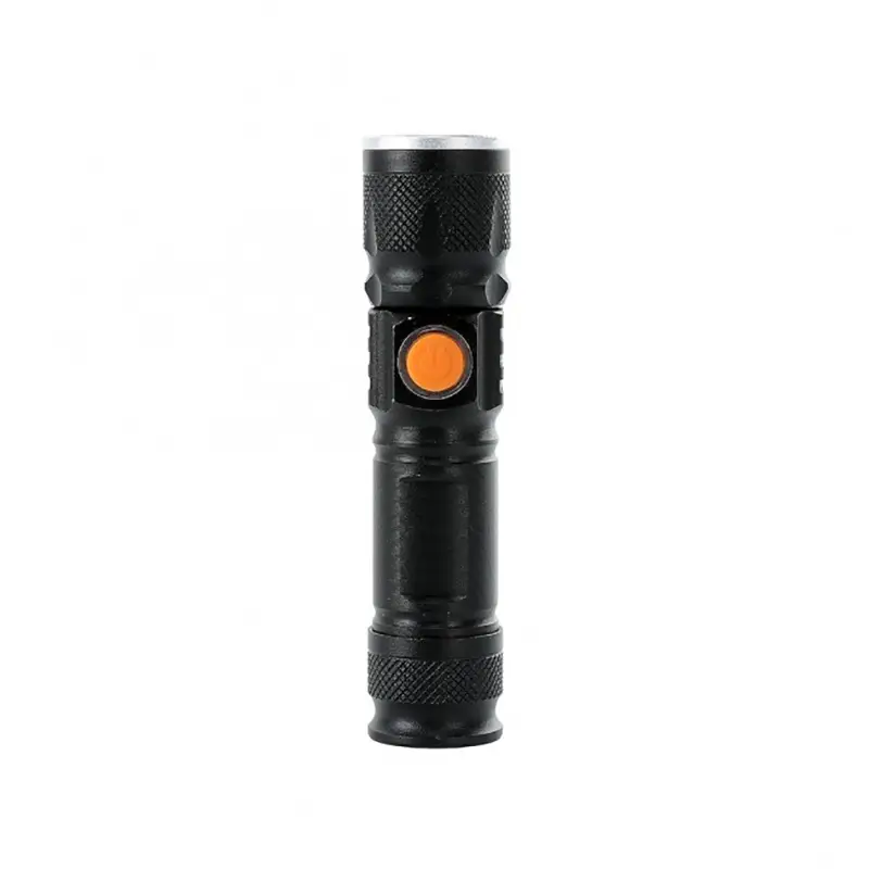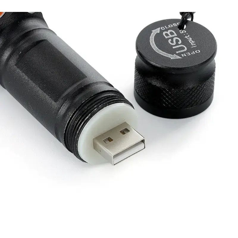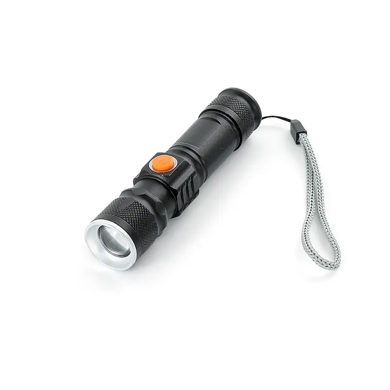 Lanterna led recarregável com zoom de regulagem e três estágios de iluminação, material metálico. Acompanha cordão de nylon e cabo USB-V8.