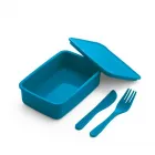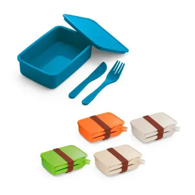 Marmita. Fibra de bambu e PP. Com 2 talheres: garfo e faca. Fecha com banda elástica. Apto para microondas (retirar a tampa). Food grade. 165 x 111 x 50 mm.